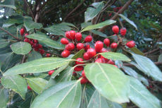 原生林の薄暗い中に鮮やかな赤色の果実が目に映える。有毒だが薬用。